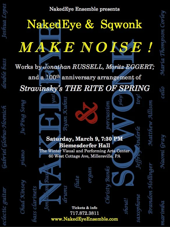 NakedEye Ensemble and Sqwonk come together to perform works for flute, clarinet, saxophone, cello, electric guitar, double bass, percussion, piano, organ, and... bass clarinet duo!