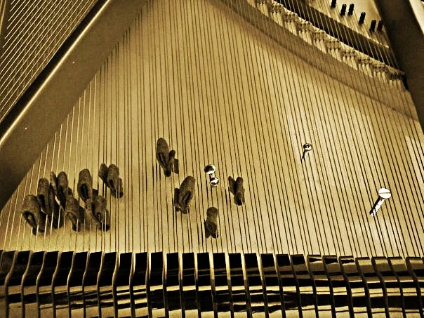 Music for prepared piano, flute, bass clarinet, and electro-acoustic ensemble with a splash of Château St Jean.