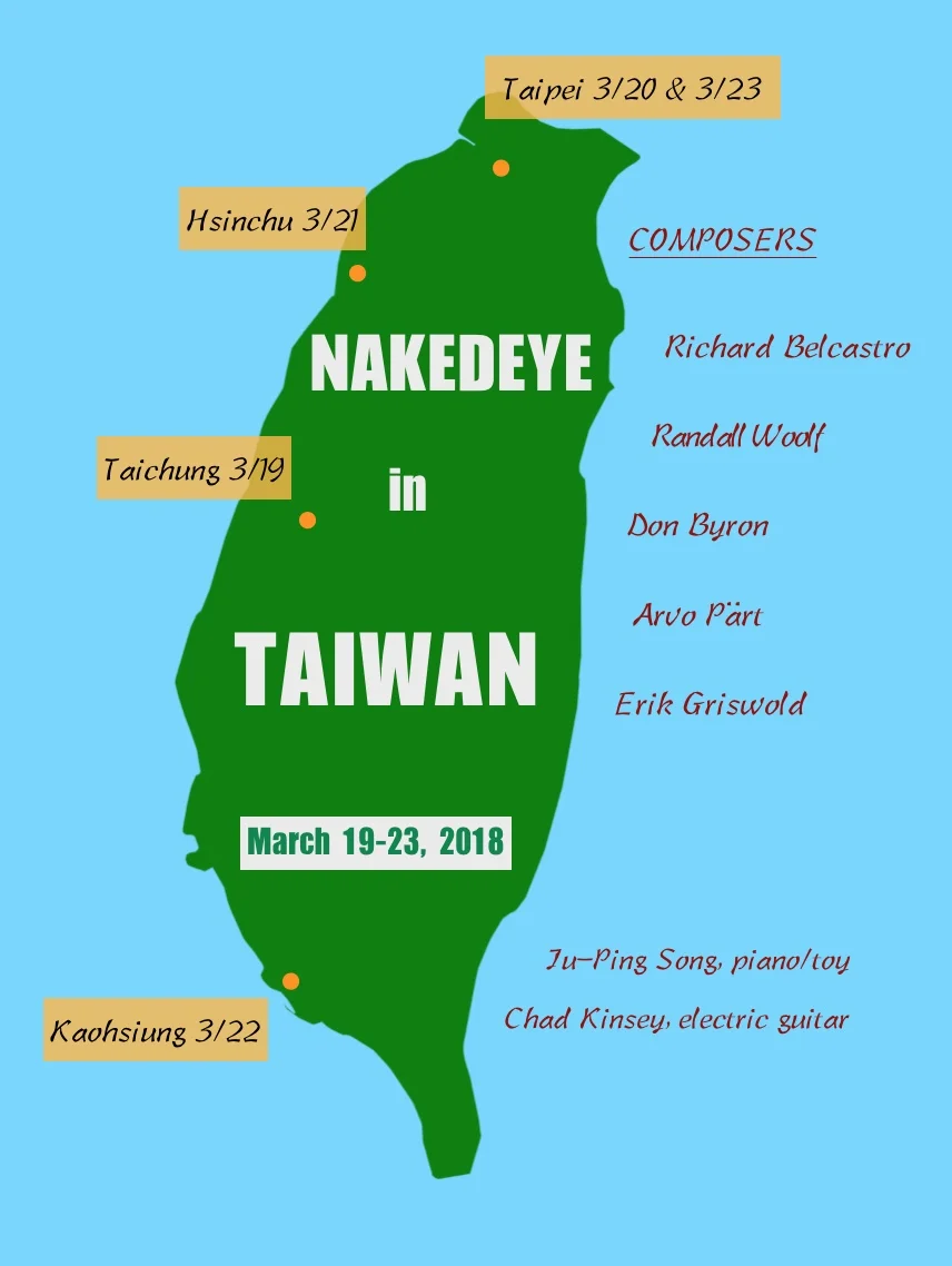 NakedEye Taiwan: five days, five venues with music for solo piano/toy piano, piano and electric guitar by Randall Woolf, Don Byron, Erik Griswold, Richard Belcastro, Arvo Pärt.